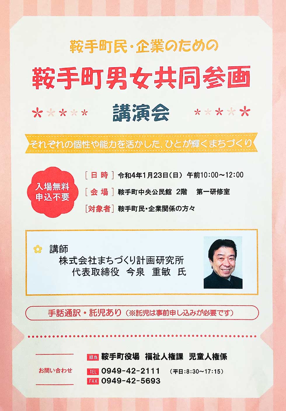 令和4年1月23日(日)10時~ 鞍手町中央公民館で、「それぞれの個性や能力を活かした、ひとが輝くまちづくり」の講演会があります。地域づくりのための何かヒントがみつかるかもしれません。