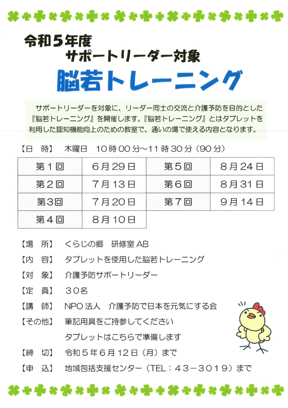 通いの場で使える脳若トレーニングを令和5年6月29日より開催します。タブレットを使用する講座で、全7回コースです。以前参加された方も参加可能です。興味のある方はぜひ参加ください。