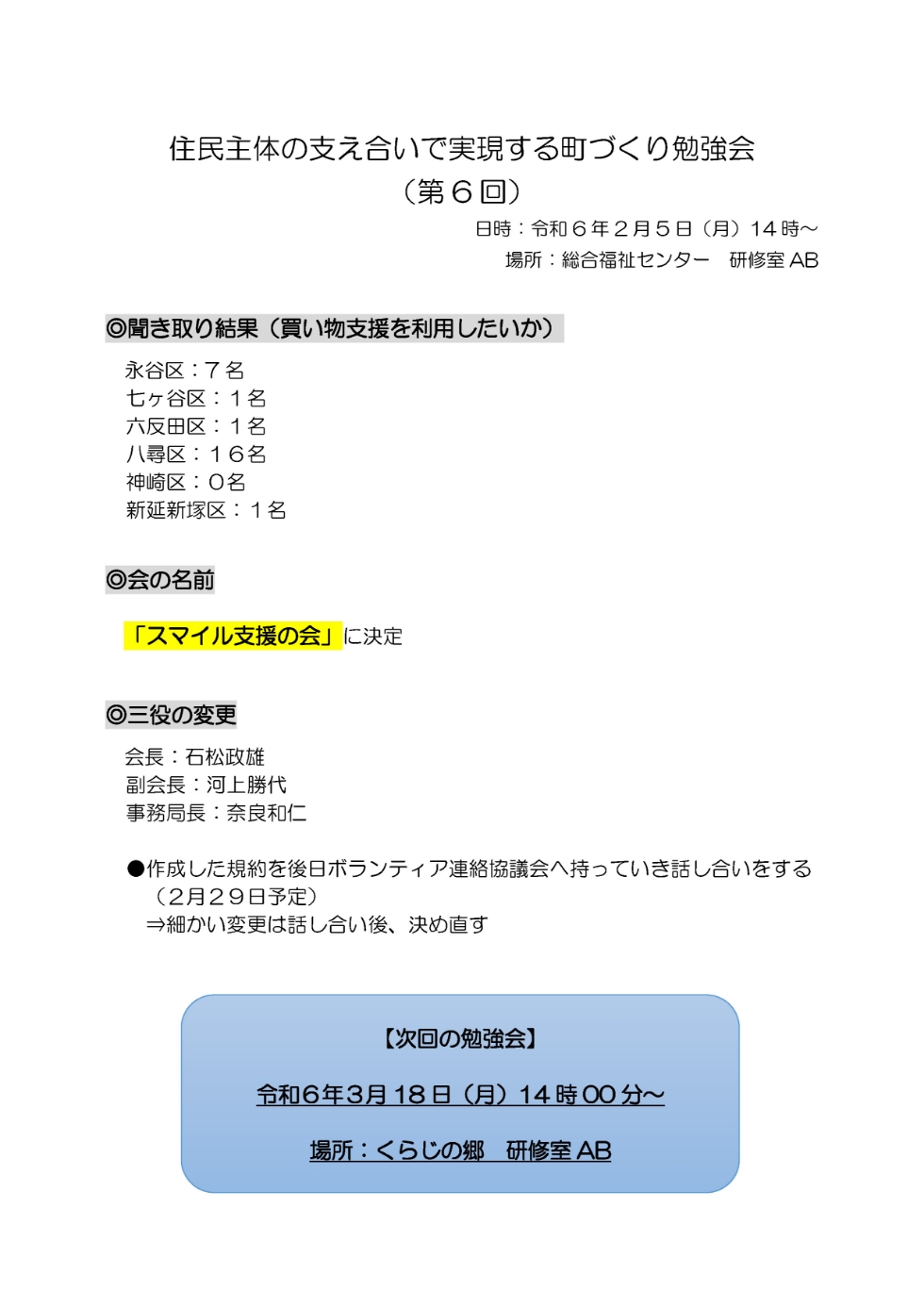 令和6年2月5日(月)14時より、第6回住民主体の支え合いで実現する町づくり勉強会を実施しました。実際にどのくらいの人が買い物支援を利用したいと思っているのか、モデル地区を中心に聞き取りを行ってもらい、情報共有をしました。また、会の名前が『スマイル支援の会』に決定しました。詳細は画像をご確認ください。