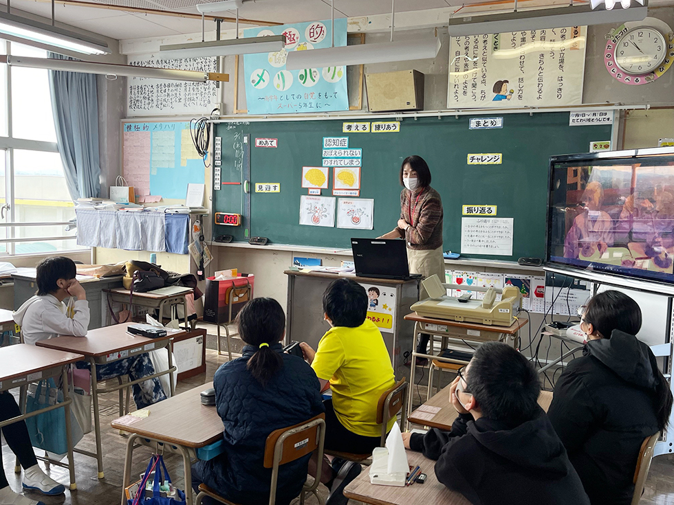 令和6年2月2日(金)に西川小学校にて5年生を対象に「認知症サポーター養成講座」を行いました。今回の講師は、ボランティアであるキャラバン・メイトの岡井いくよさんでした。講座を受けた小学生からは、「オレンジリングをつけて応援者になりたい」「自尊心を傷つけないで優しく教えてあげようと思った」などたくさんの感想をいただきました。