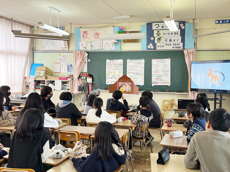 令和6年2月16日(金)に剣南小学校にて5年生を対象に「認知症サポーター養成講座」を行いました。今回の講師は、ボランティアであるキャラバン・メイトの河上勝代さんでした。講座を受けた小学生からは、「差別せず、少しでも認知症の人の助けになるようにやさしくしたい」「認知症の人が1人で抱え込まないようにみんなと助け合って平和な鞍手町にしていきたい」などたくさんの感想をいただきました。