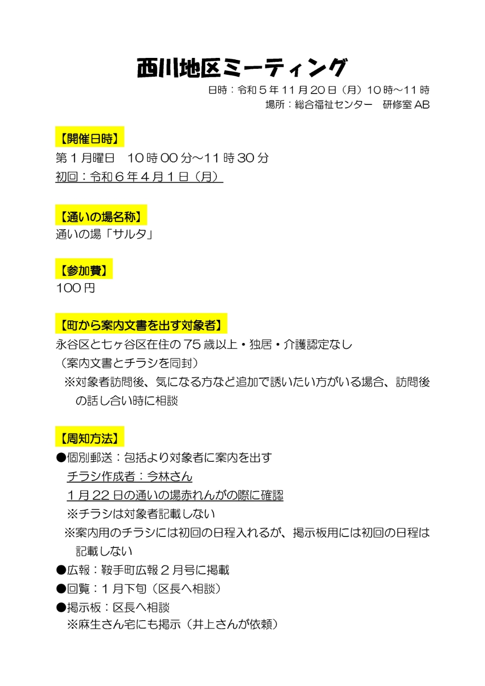 令和5年11月20日(月)10時~総合福祉センター研修室ABにて西川地区ミーティングを行いました。10月18日に行われたコミュニティミーティングの振り返りや新たに開設する通いの場について決めていきました。永谷区公民館で新たに立ち上げる通いの場の名称は、通いの場「サルタ」で初回は令和6年4月1日(月)10時~に決定しました。今後も開催に向けて話し合いを進めていきます。