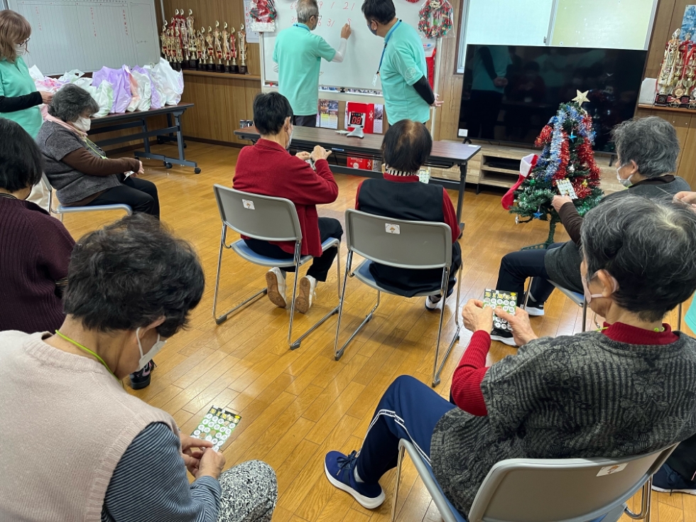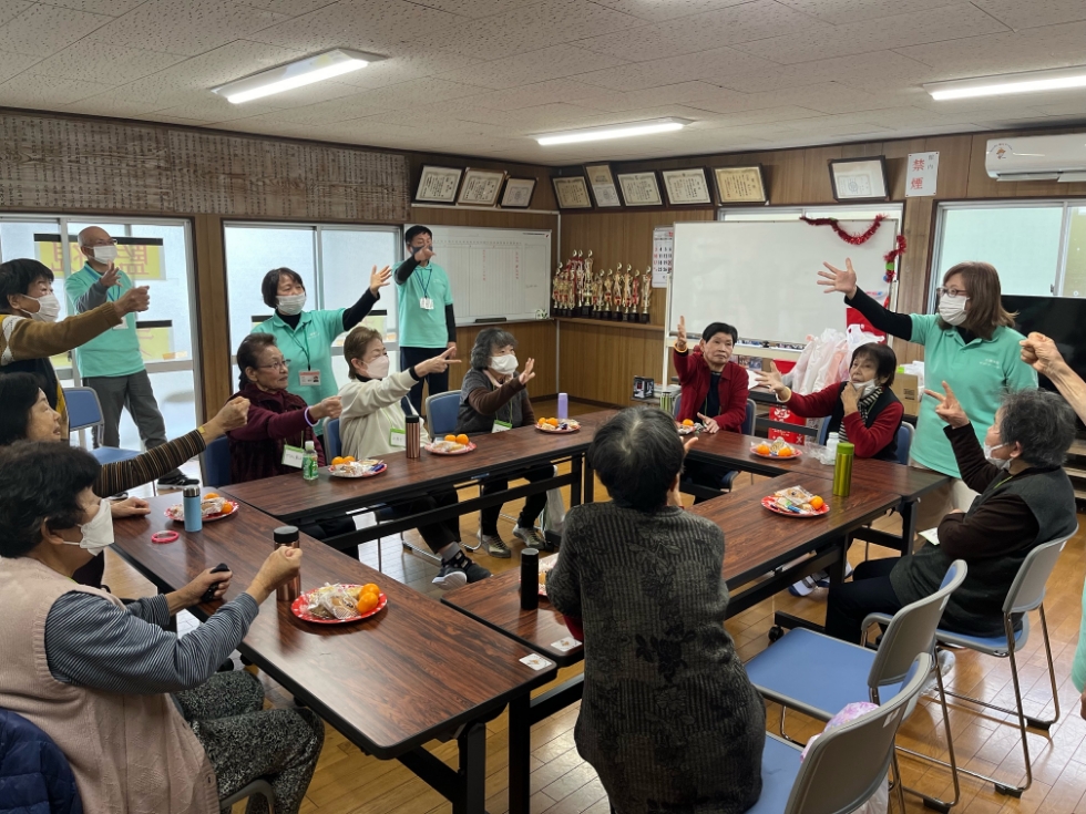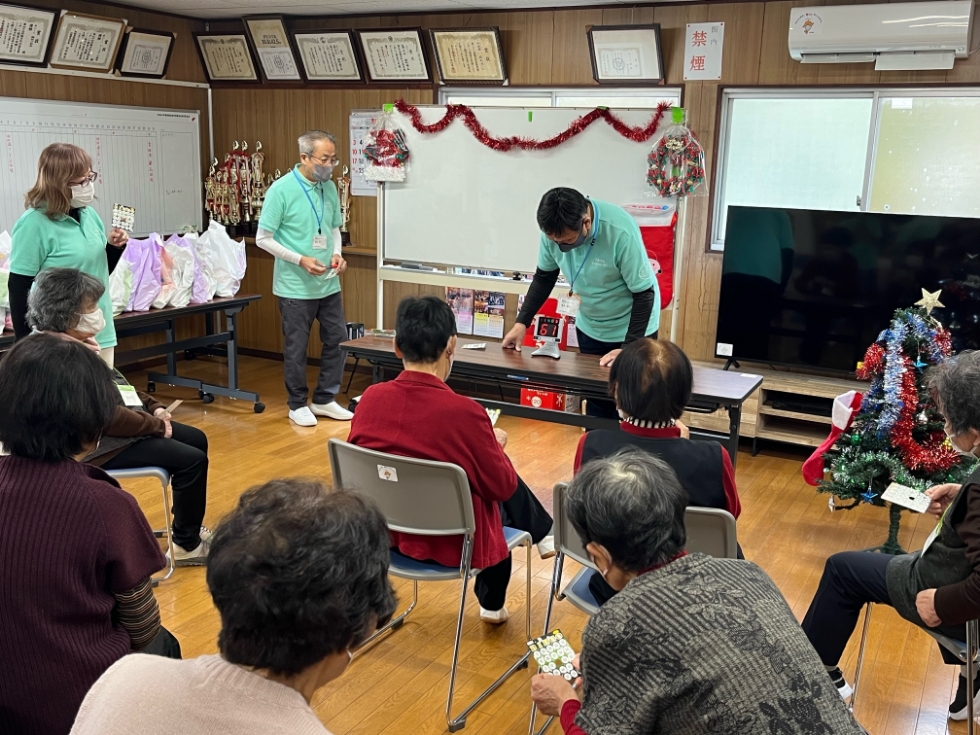令和5年12月19日(火)に昭和通り区公民館にて通いの場剣北「つどい」」が開催されました。お楽しみ会ということで、体操や歌、景品のある備後退会などを行いました。ボランティアが事前に公民館の飾りつけを行い、クリスマス気分で楽しい空間でした。最後にはお菓子を食べたり、おしゃべりしたり、参加者もボランティアも一緒に盛り上がりました。
