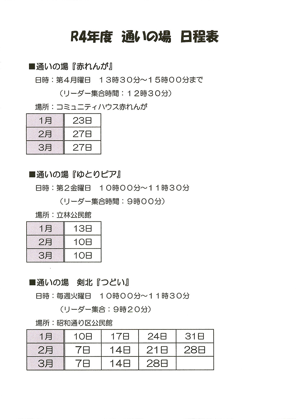 令和4年度の各通いの場の日程表をお知らせします。詳細は画像を確認ください。