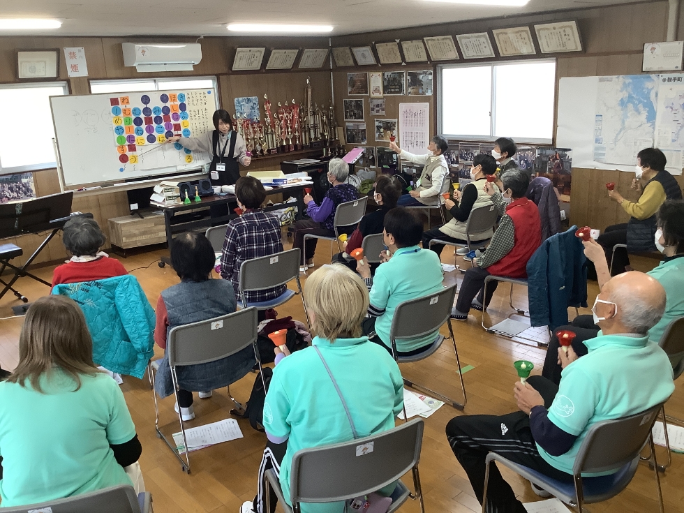 本日のテーマは音楽サロンで、講師はフカノ楽器店さんでした。寒い日でしたが、体を動かしながら歌ったり笑ったりすることで体が温かくなりました。他にも、音階の違うメロディベルを一人2個持って、歌いながら奏でました。それぞれ違う音階のベルをみんなで奏でることで、一つの美しいメロディが完成し一体感が生まれました♪