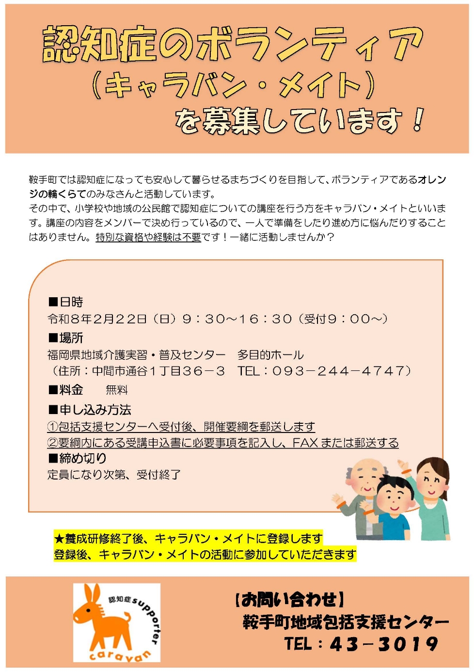 鞍手町では「認知症になっても安心して暮らせる町づくり」を目指して、ボランティアであるキャラバン・メイトのみなさんと小学校や地域の公民館をまわって「認知症サポーター養成講座」を行っています。認知症サポーターとは、認知症について正しく理解し、認知症の人や家族を温かく見守る応援者(サポーター)のことです。