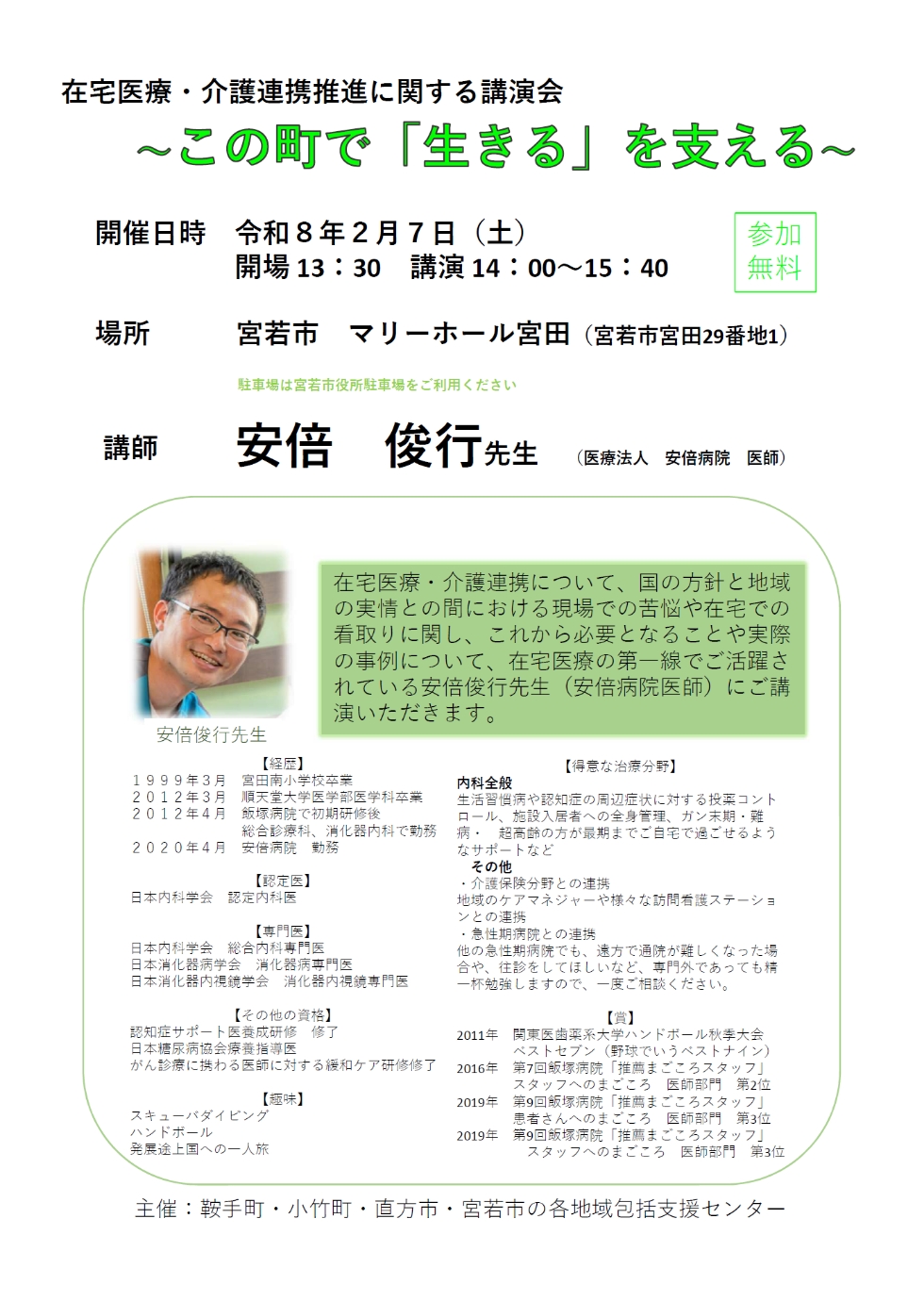 鞍手町・直方市・宮若市・小竹町では、在宅医療・介護連携の推進を図るため、下記の通り講演会を開催します。内容は、在宅医療・介護連携について地域の実情や、看取りについて、これから必要となることなどです。興味のある方は、鞍手町地域包括支援センターまでお申し込みください。(申込期限:令和8年1月30日)