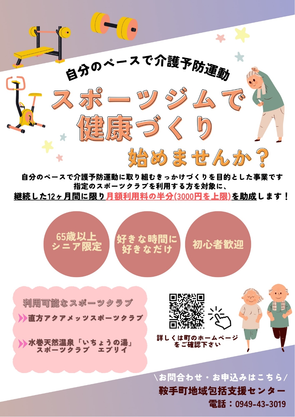 地域包括支援センターでは、鞍手町の住民が慣れ親しんだ地域でいつまでも元気でいきいきと生活ができるように、申し込みのあった地域の公民館で介護予防教室(ふれあい教室)を行っています。