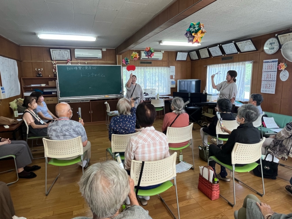 懐かしい曲をみんなで歌ったり、トーンチャイムという楽器を使い、みんなで演奏をしたりしました。トーンチャイムの音色は、深みのある響きで心地の良い音色でした♪
